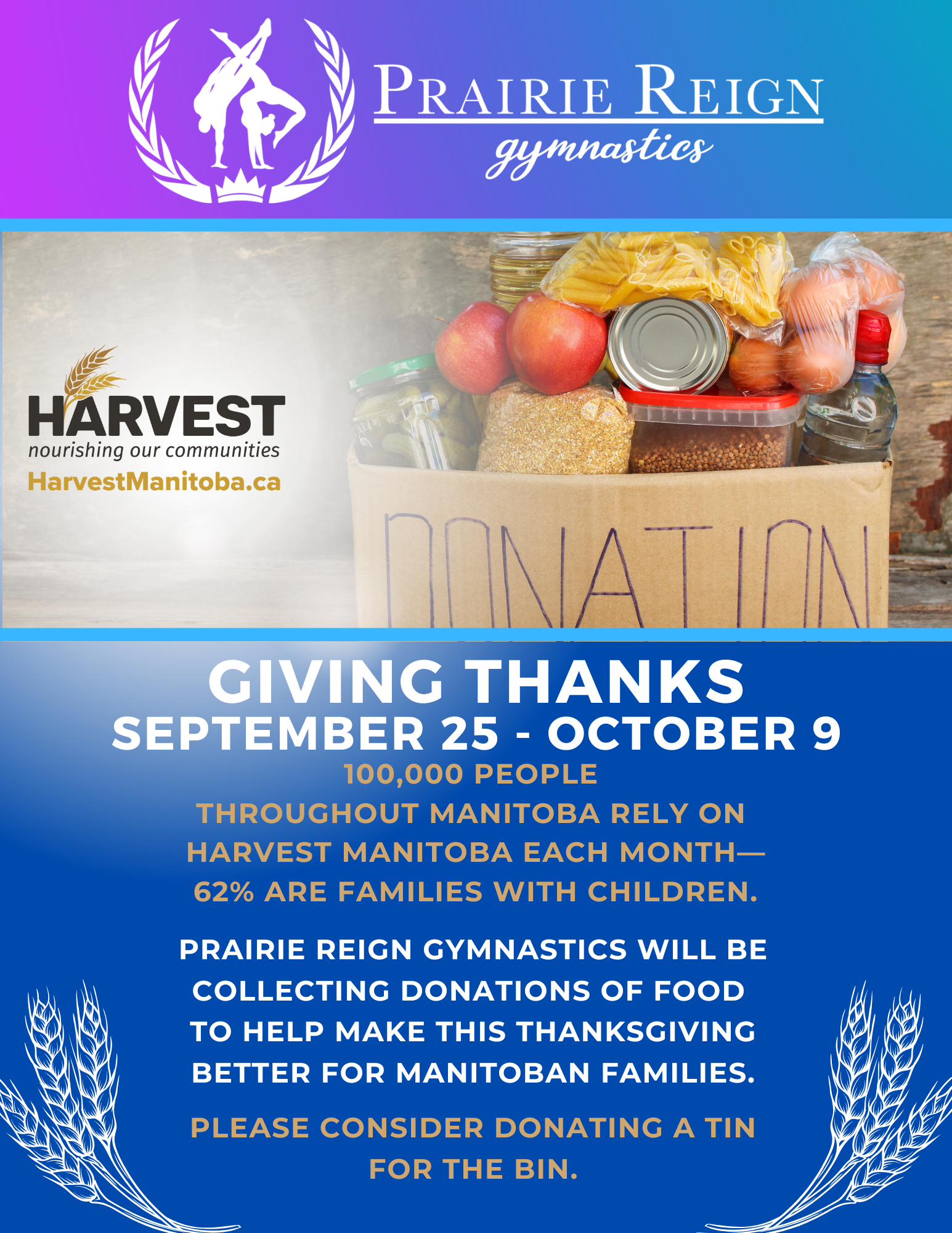 Prairie Reign's 5th annual food drive for Harvest Manitoba starts tomorrow, September 25th and will run until October 9th. Far too many Manitobans go without, including children. Collection bins are located in the lobby—please consider donating a "tin for the bin," to help feed hungry Manitobans this Thanksgiving.